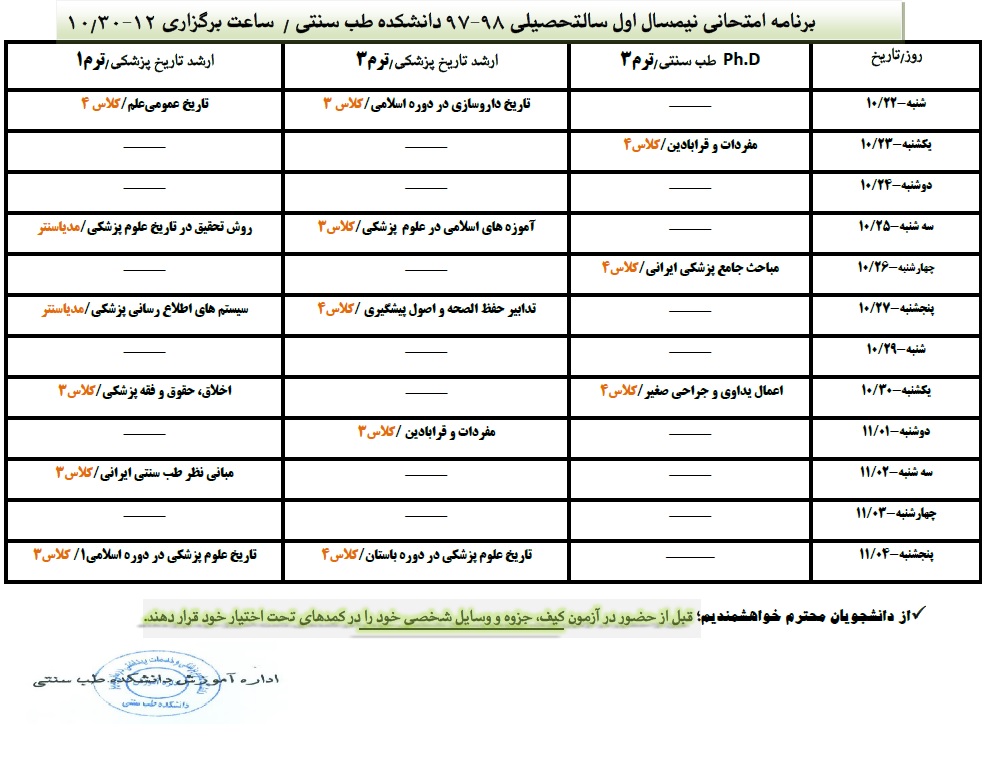 برنامه امتحانی برنامه امتحانی نیمسال اول کد خبر : 61115 کپی کلمات کلیدی : طب سنتی برنامه امتحانی نیمسال اول