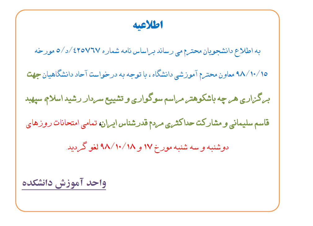 تاریخ انتشار : دوشنبه ۱۶ دی ۱۳۹۸ تعداد بازدید کنندگان خبر : 44 زمان مطالعه : 1 دقیقه اطلاعیه فوری لغو امتحانات کد خبر : 61186 کپی کلمات کلیدی : اطلاعیه امتحانات لغو برگزاری آزمونها ارسال نظر ثبت