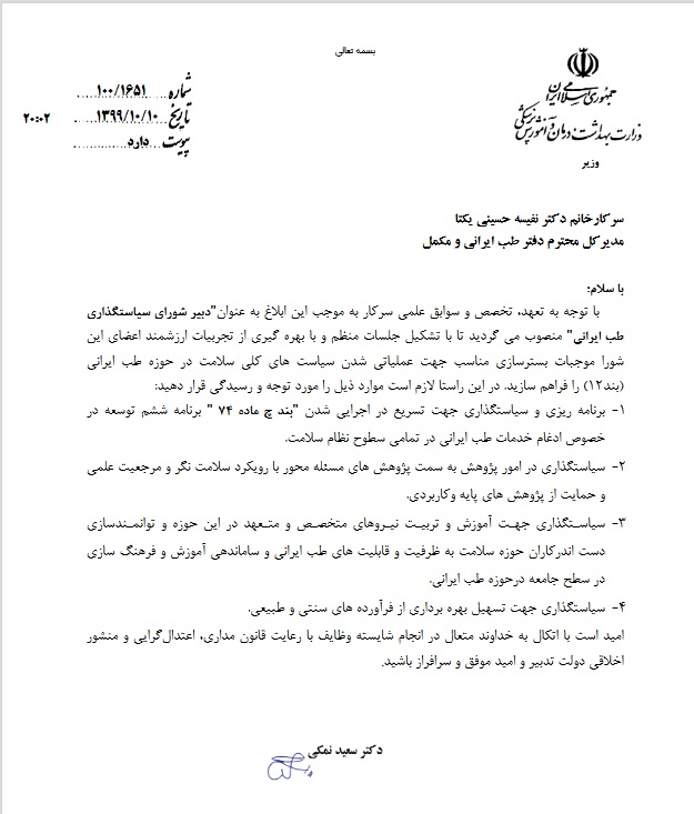 سرکار خانم دکتر نفیسه حسینی یکتا به دبیری شورای سیاستگذاری طب ایرانی