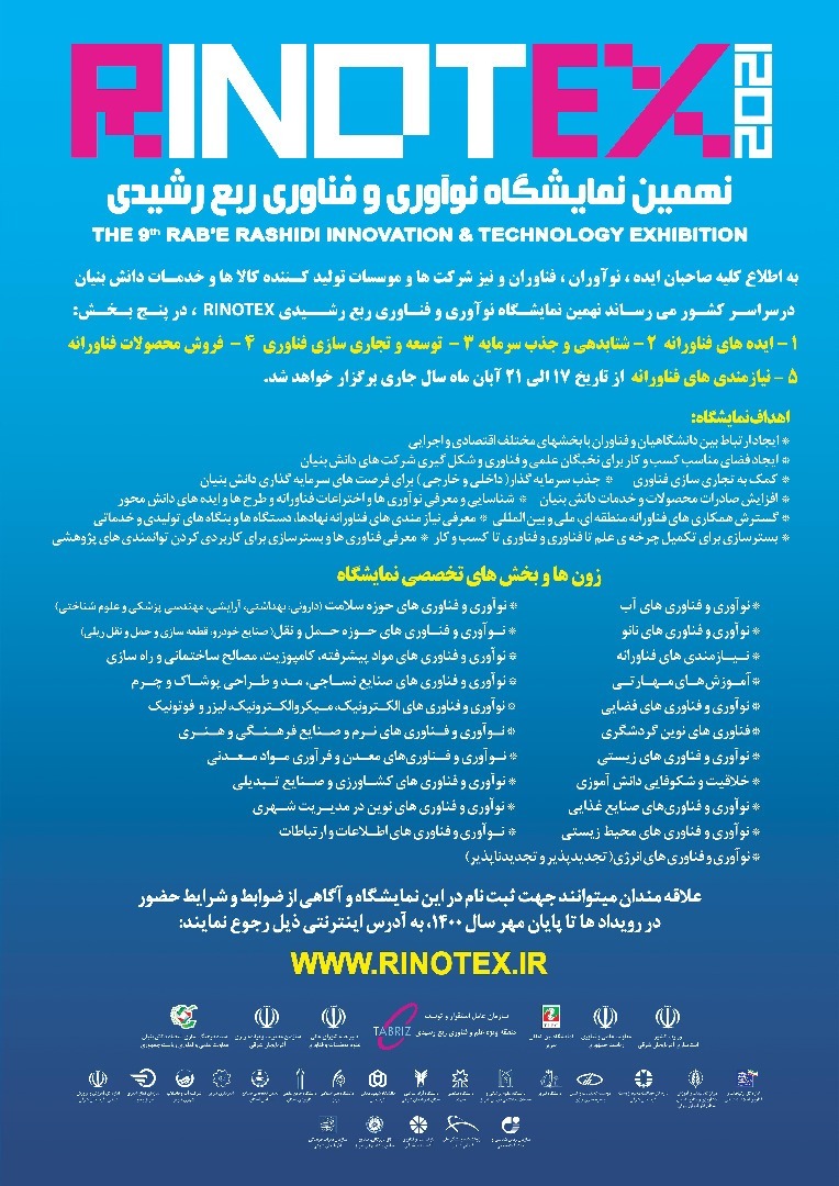 نهمین نمایشگاه نوآوری و فن آوری ربع رشیدیRinotex2021 در زمینه های تخصصی نوآوری و فن آوری های حوزه سلامت، از 17 تا 21 آبان در نمایشگاه بین المللی برگزار خواهد گردید. علاقه مندان جهت حضور در این نمایشگاه میتوانند برای دریافت اطلاعات بیشتر به سایت WWW.RINOTEX.IR مراجعه نمایند.