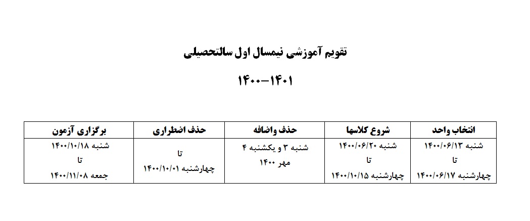 شروع نیمسال دوم سالتحصیلی 1401 - 1400 از چهاردهم اسفندماه 1400 خواهد بود.