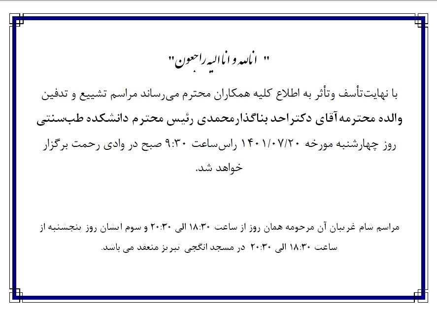 اطلاعیه مراسم ترحیم والده مکرمه جناب آقای دکتر بناگذار کد خبر : 61322 کپی کلمات کلیدی : دکتربناگذار اعلامیه مجلس ترحیم درگذشت والده مکرمه